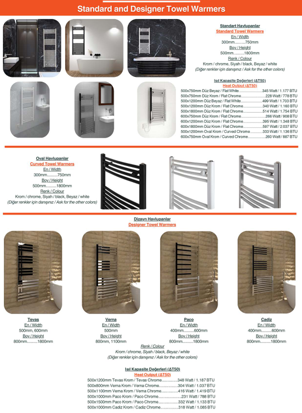 Havlupan çeşitlerimiz krom, boyalı, elektrikli termostatlı olarak üretilmektedir. Havlupanlarımız ev ısıtma tetsisatlarınıza bağlanabildiği gibi ayrıca tesisatlarınızdan bağımsız direkt elektriğe bağlanarak kullanılan modellerimiz de mevcuttur.